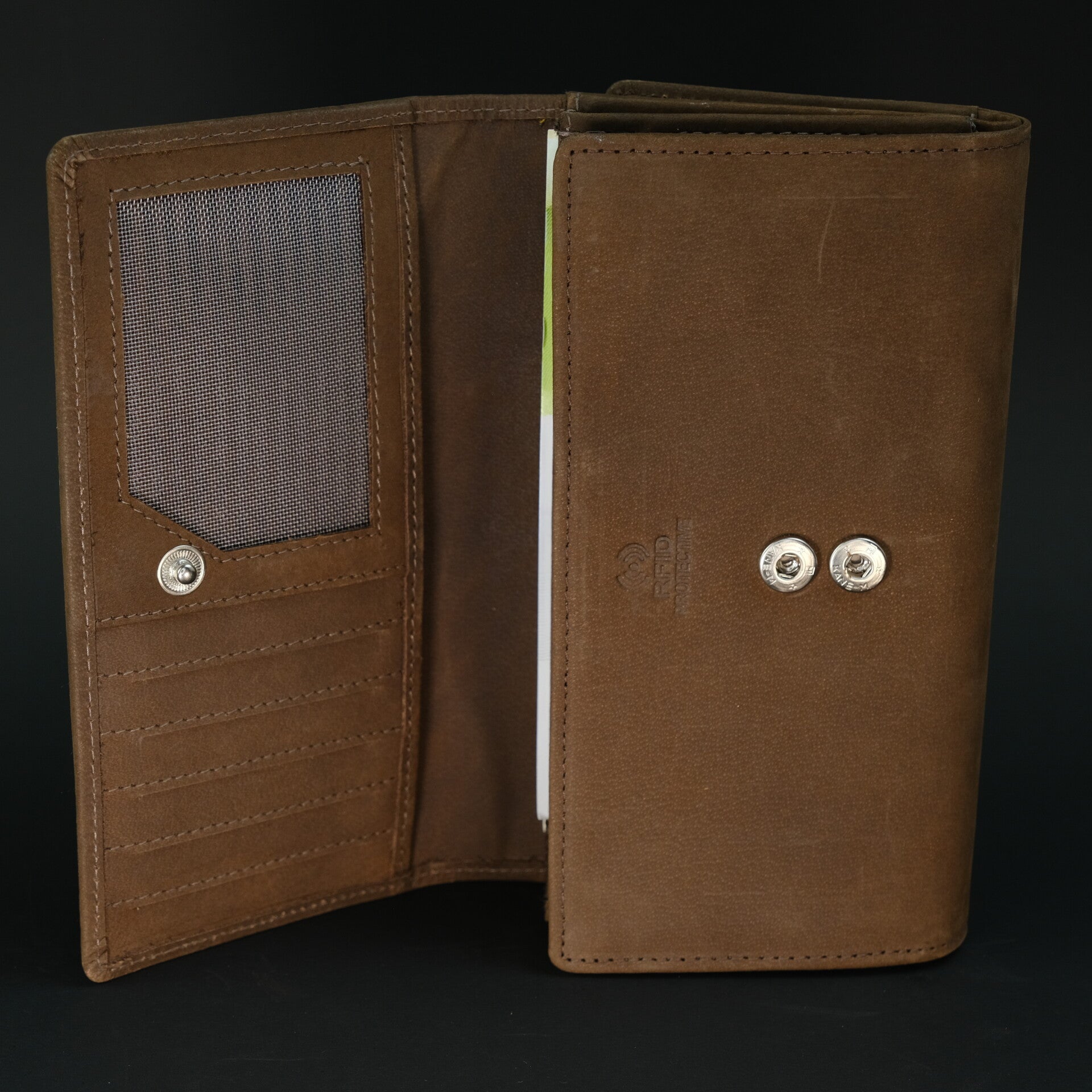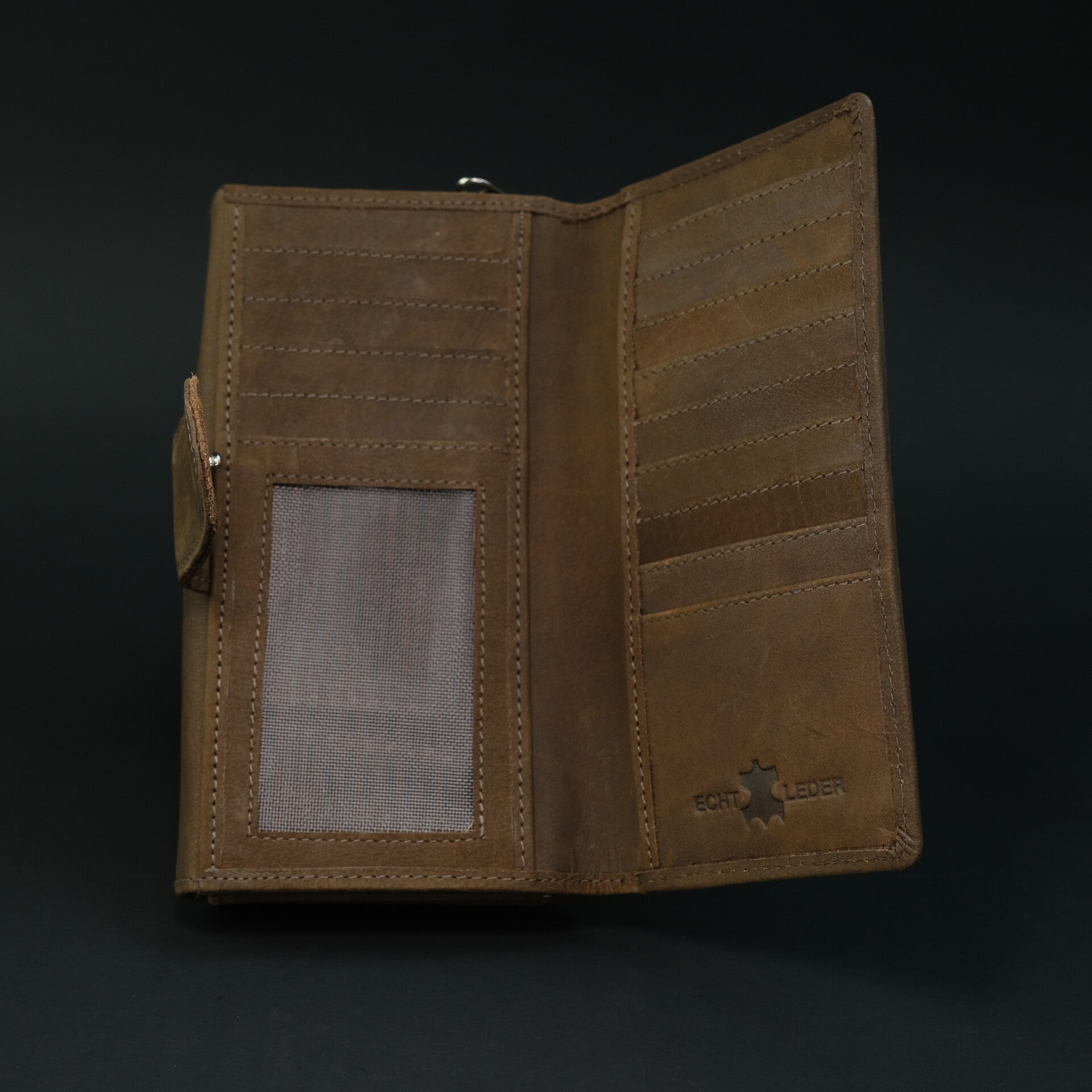 Mit ihren 20 sorgsam vernähten Kartenfächern, den großzügigen Dokumentenbereichen und dem extra großen, rundum schließenden Kleingeldfach bietet die HUNTERIA enorm viel Platz und maximale Übersicht. Die doppelt verstellbaren Druckknöpfe sorgen dafür, dass die Börse jederzeit sicher geschlossen bleibt – egal, ob sie schlank befüllt ist oder richtig viel Inhalt mit sich trägt.